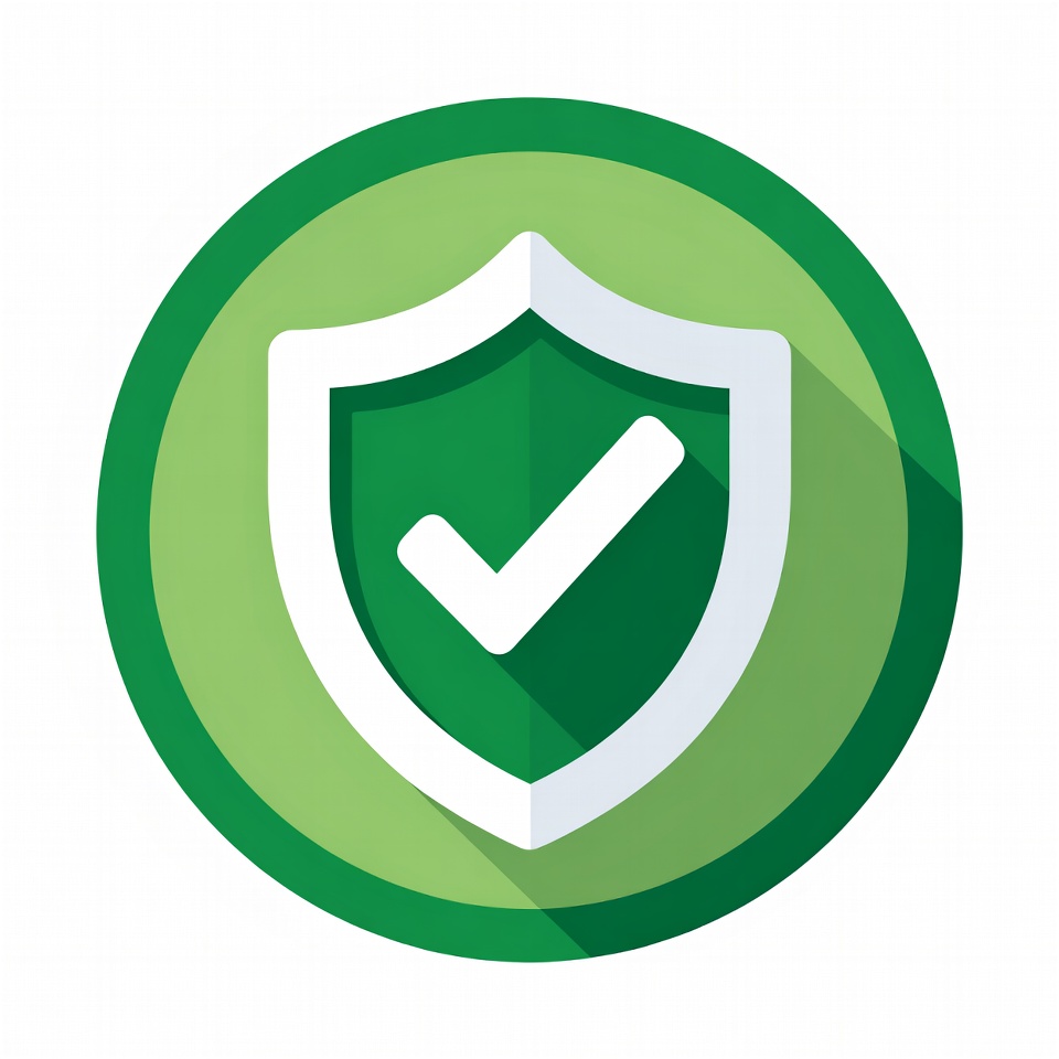 A simple green shield featuring a white check mark is displayed, symbolizing protection and security in a modern graphic style.