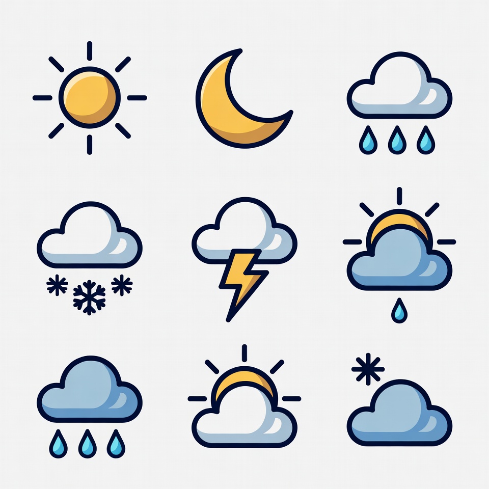 Various weather icons including sun, moon, clouds, rain, snow, and lightning, representing different weather conditions.