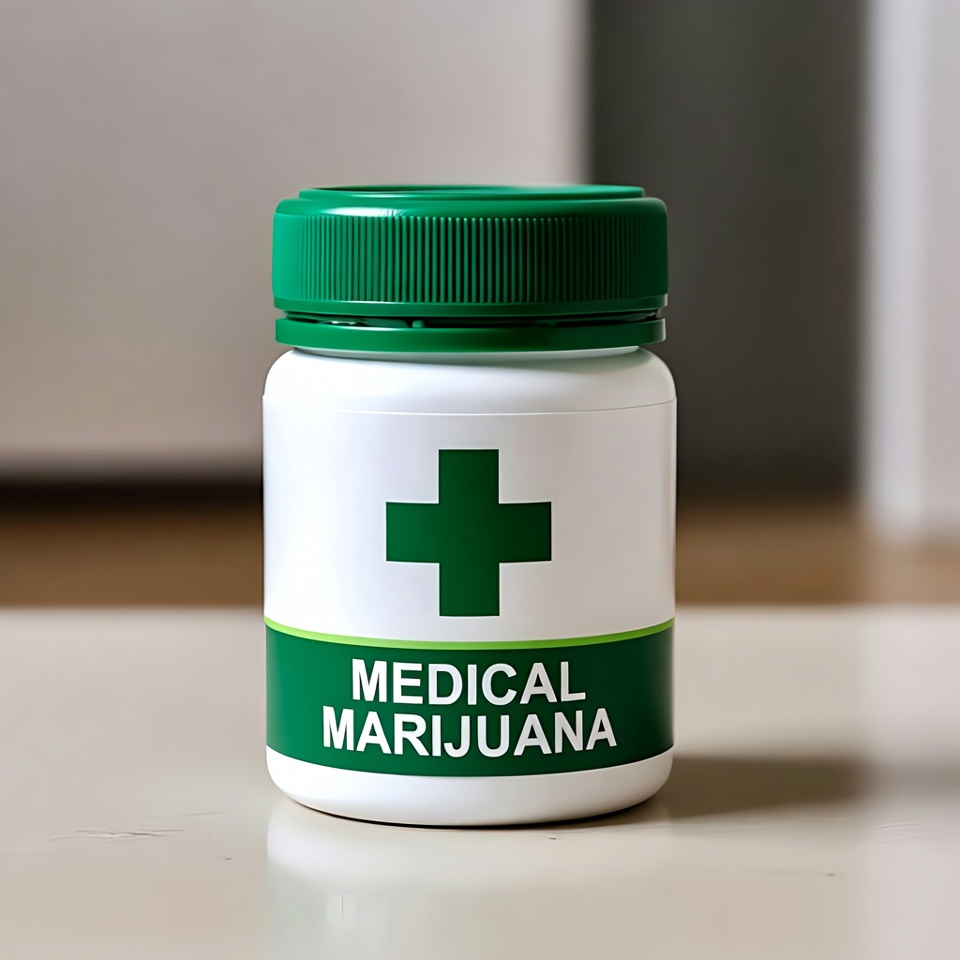 A white container with a green lid sits on a light-colored table. The label shows a green cross and reads medical marijuana clearly.