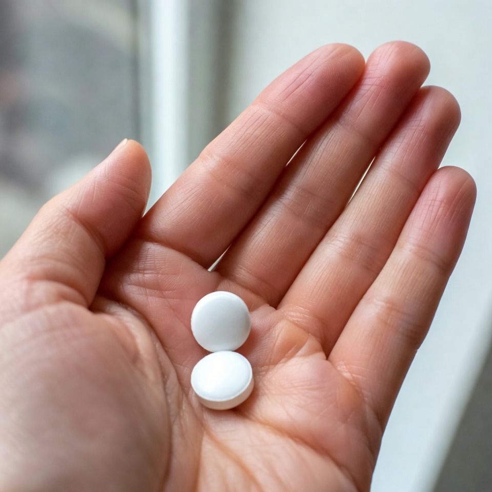 A hand holds two white tablets, resting on a palm, near a window with soft natural light streaming through, suggesting a moment of calm.
