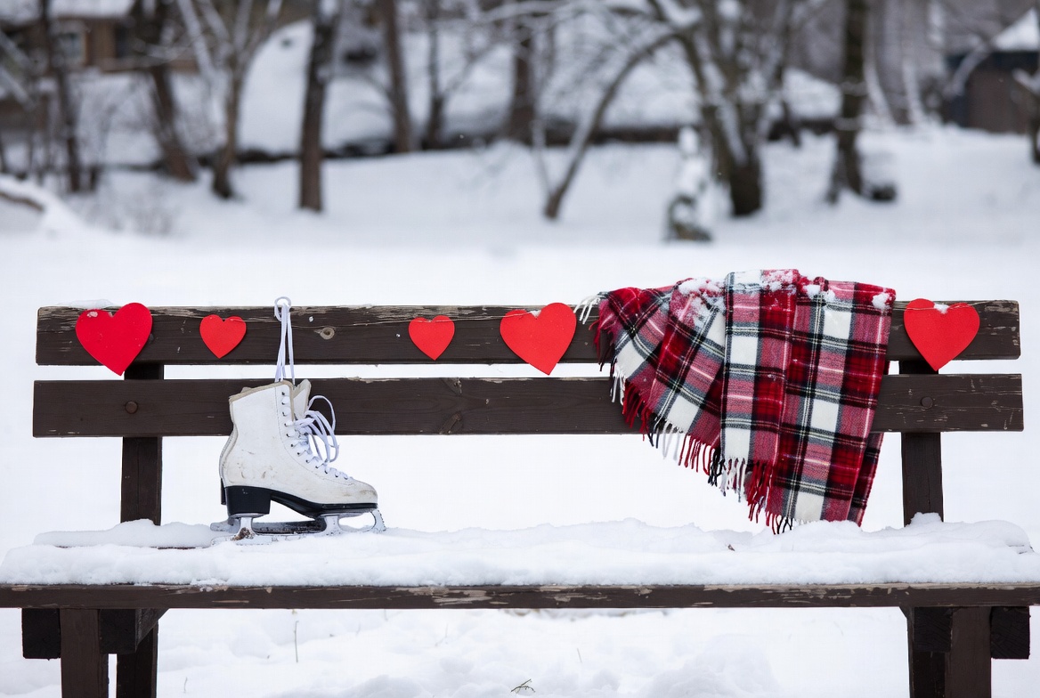 bench, blankets, cold weather, decoration, festive, heart decorations, ice skating, leisure, nature, outdoor, parks, romance, scarf, seasonal, snow, snowy landscape, sport, trees, white skate, winter