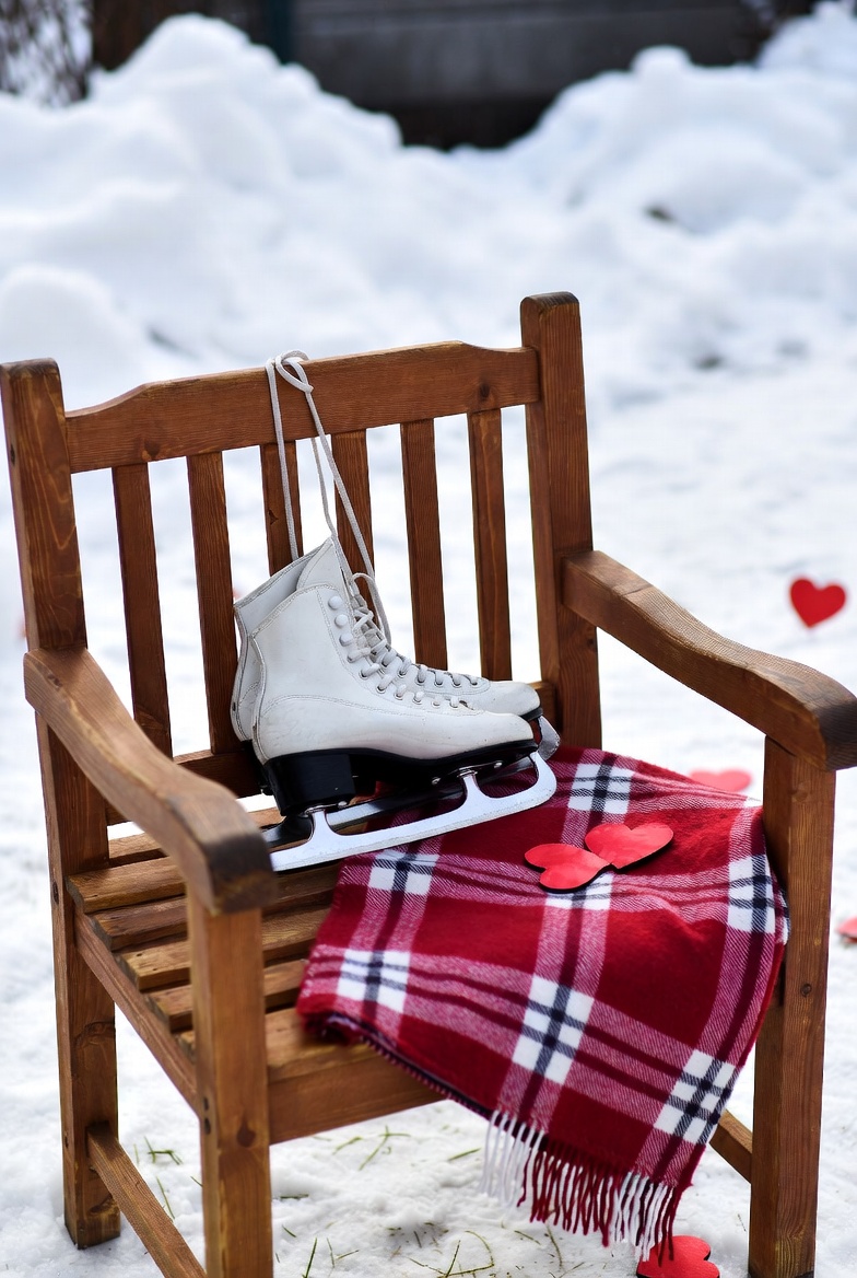 blanket, chair, cold weather, cozy, decoration, festive, heart shapes, ice skates, ice skating, leisure, outdoor, plaid, red, relaxation, romantic, seasonal activity, snow, white, winter, wooden furniture