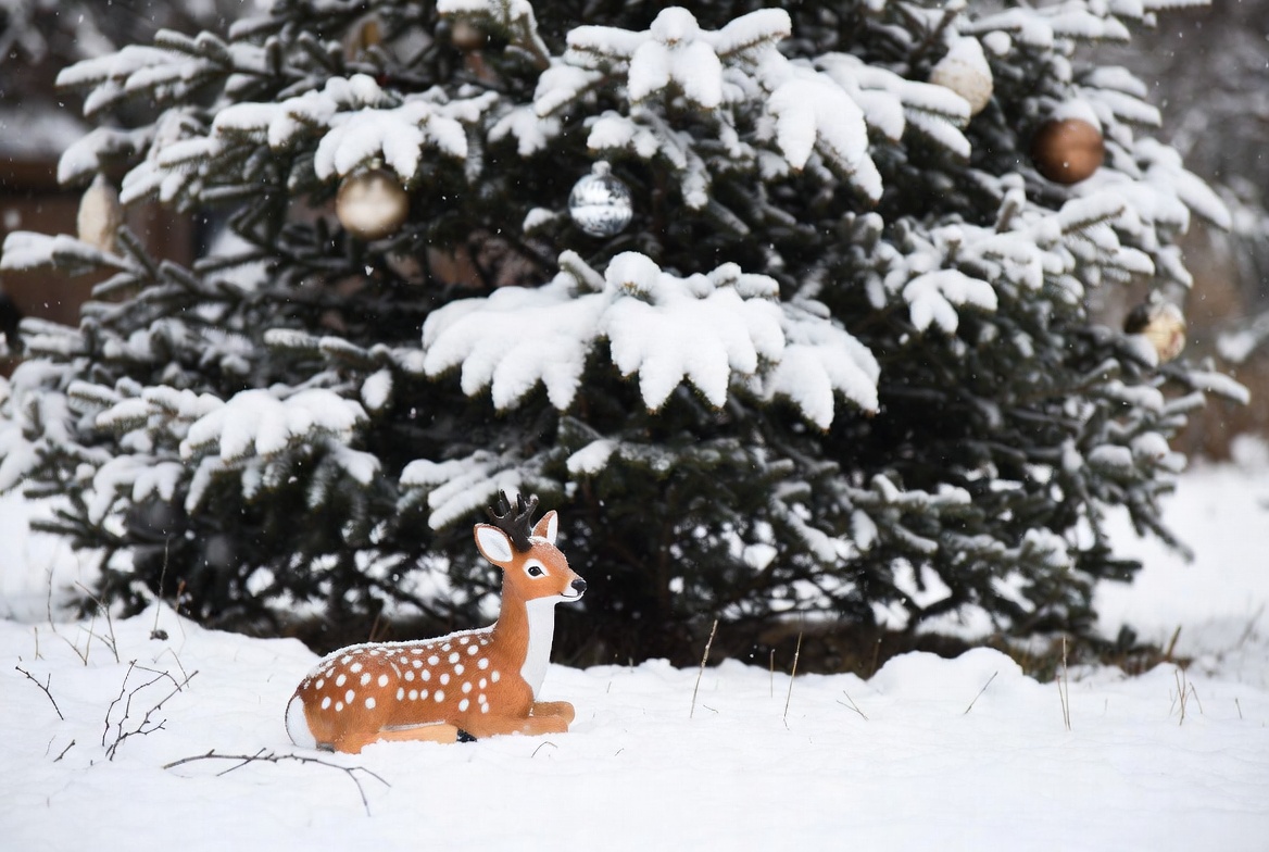 A decorative deer rests on the snowy ground beside a Christmas tree covered in white snow and ornaments during winter.