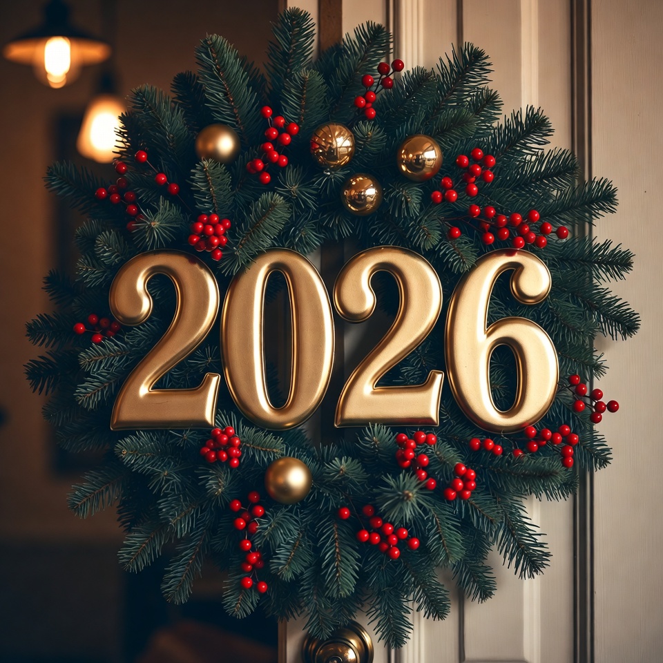 A festive wreath adorned with golden numbers 2026, red berries, and ornaments, welcoming the new year with warmth and cheer.
