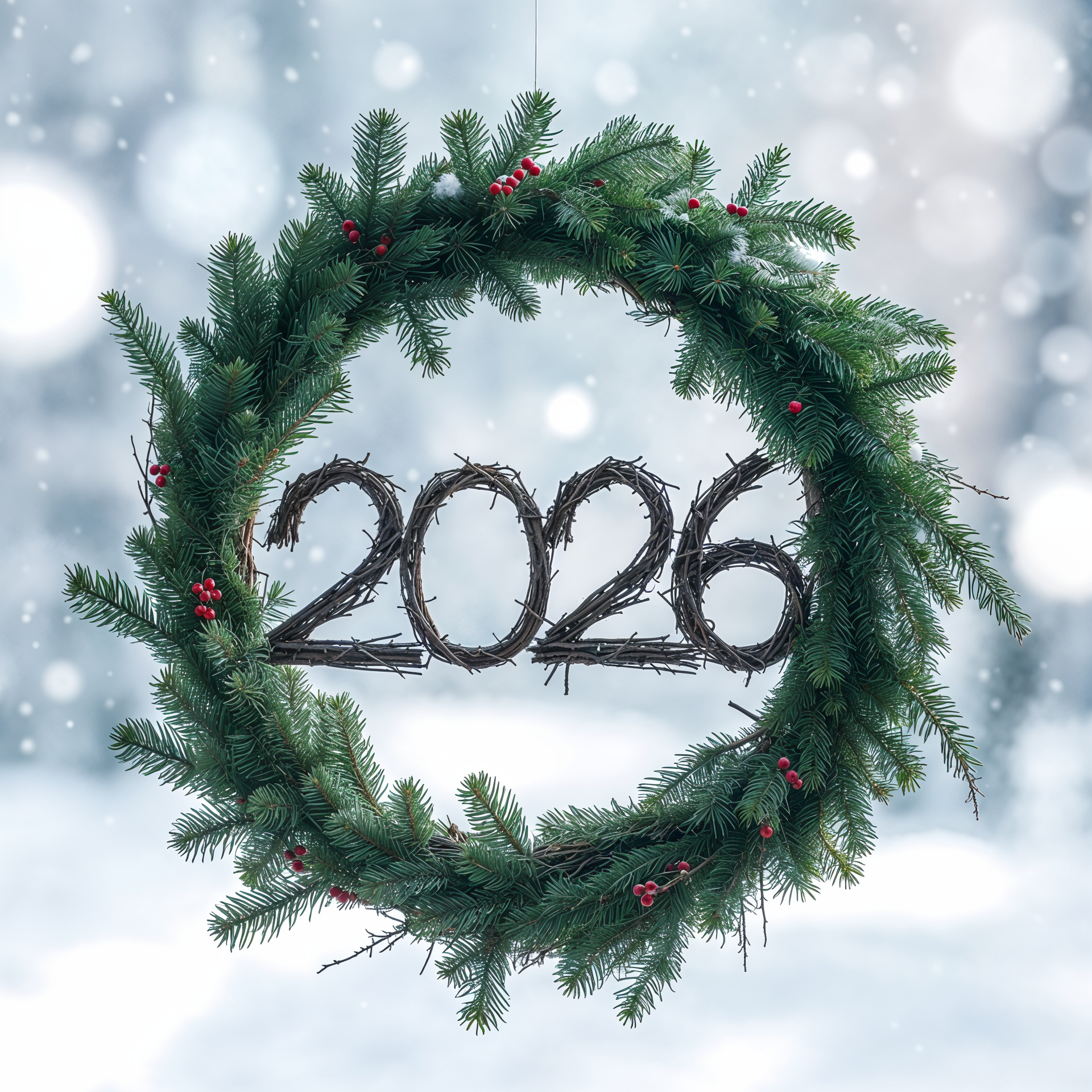 2026, celebration, circle, decoration, design, festive, greenery, holiday decor, home, nature, new year, ornament, outdoors, pine branches, red berries, season, seasonal, snow, winter, wreath