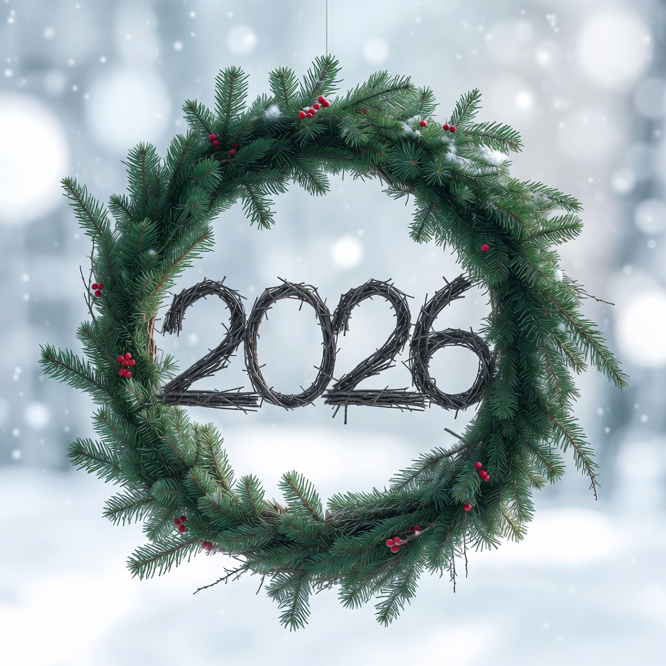 A festive wreath decorated with pine branches and red berries shows the year 2026, set against a snowy winter backdrop.