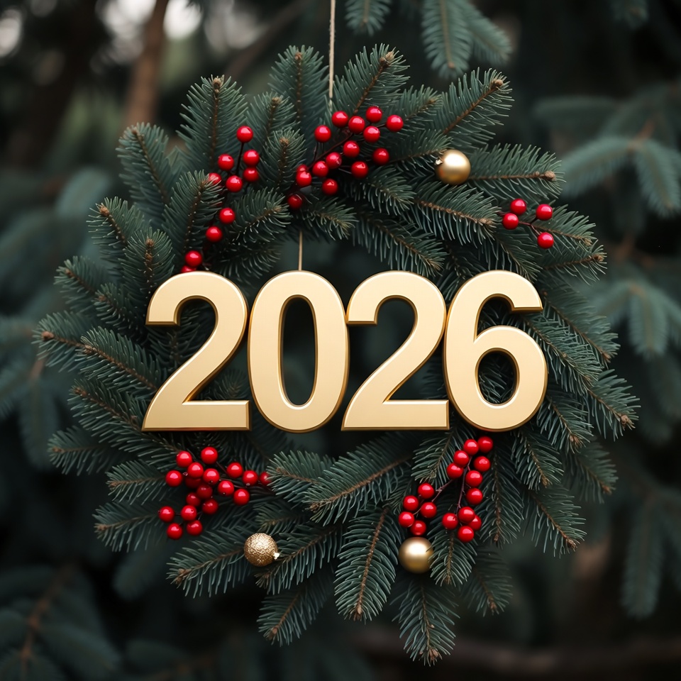 A festive wreath featuring the year 2026, decorated with red berries and gold accents, hanging among evergreen branches.
