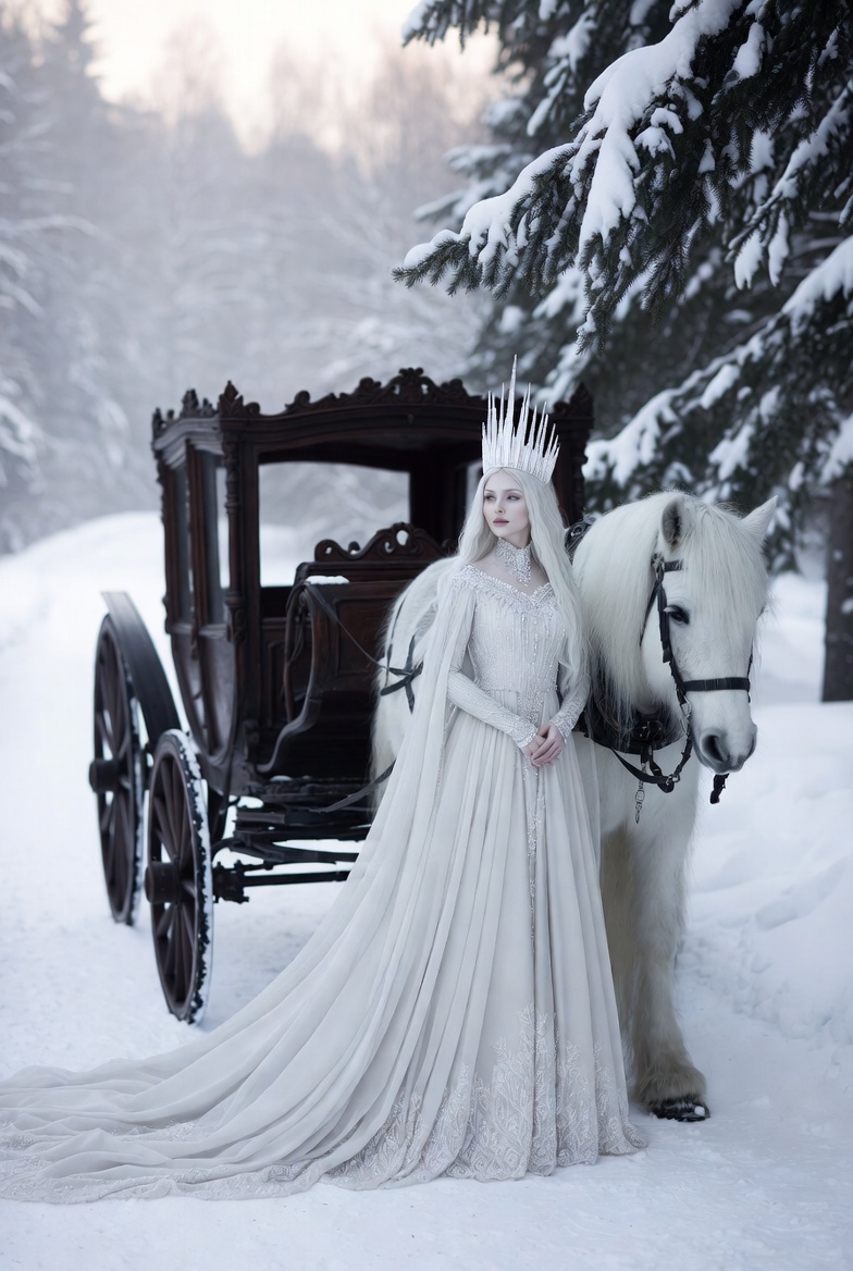 A woman dressed in white stands beside a horse-drawn carriage in a snowy forest, surrounded by tall pine trees and a misty atmosphere.
