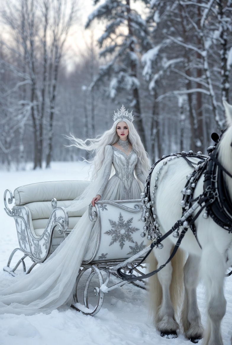 A mystical woman in a silver gown stands beside a beautiful sleigh pulled by a white horse in a snowy forest, capturing winter magic.