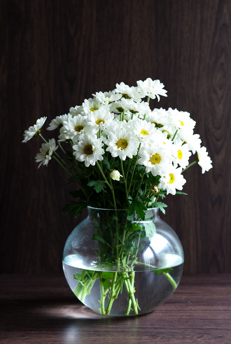 Bright white daisies in glass vase