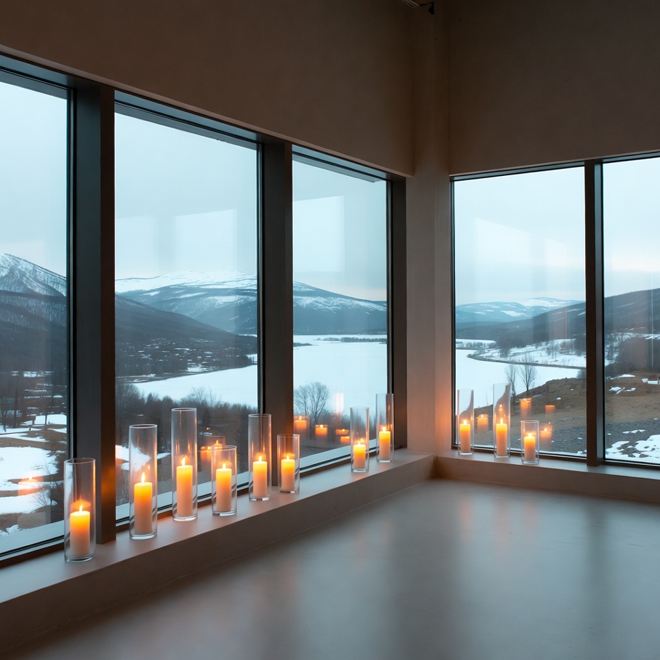 Warm candles illuminate a spacious room that overlooks a snowy lake and mountains during twilight, creating a peaceful atmosphere.
