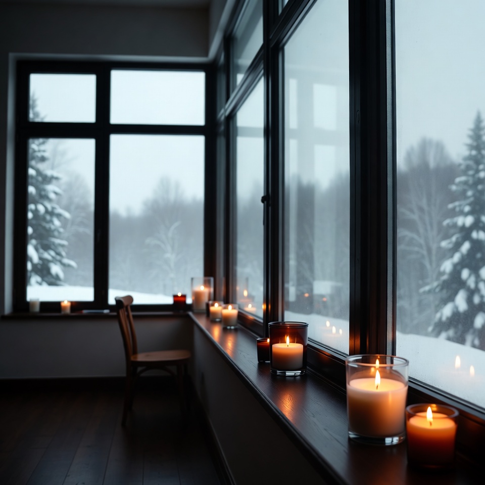Candles are lit on a windowsill in a cozy room. Outside, snow falls gently, creating a quiet winter scene. The atmosphere feels warm and inviting.