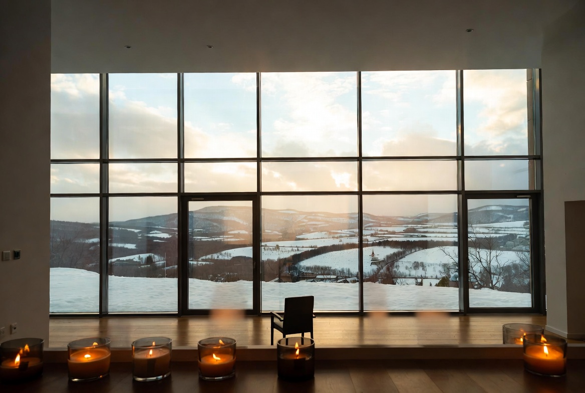 A cozy cabin features large windows showing a snowy landscape at sunset. Candles create a warm atmosphere inside the quiet space.