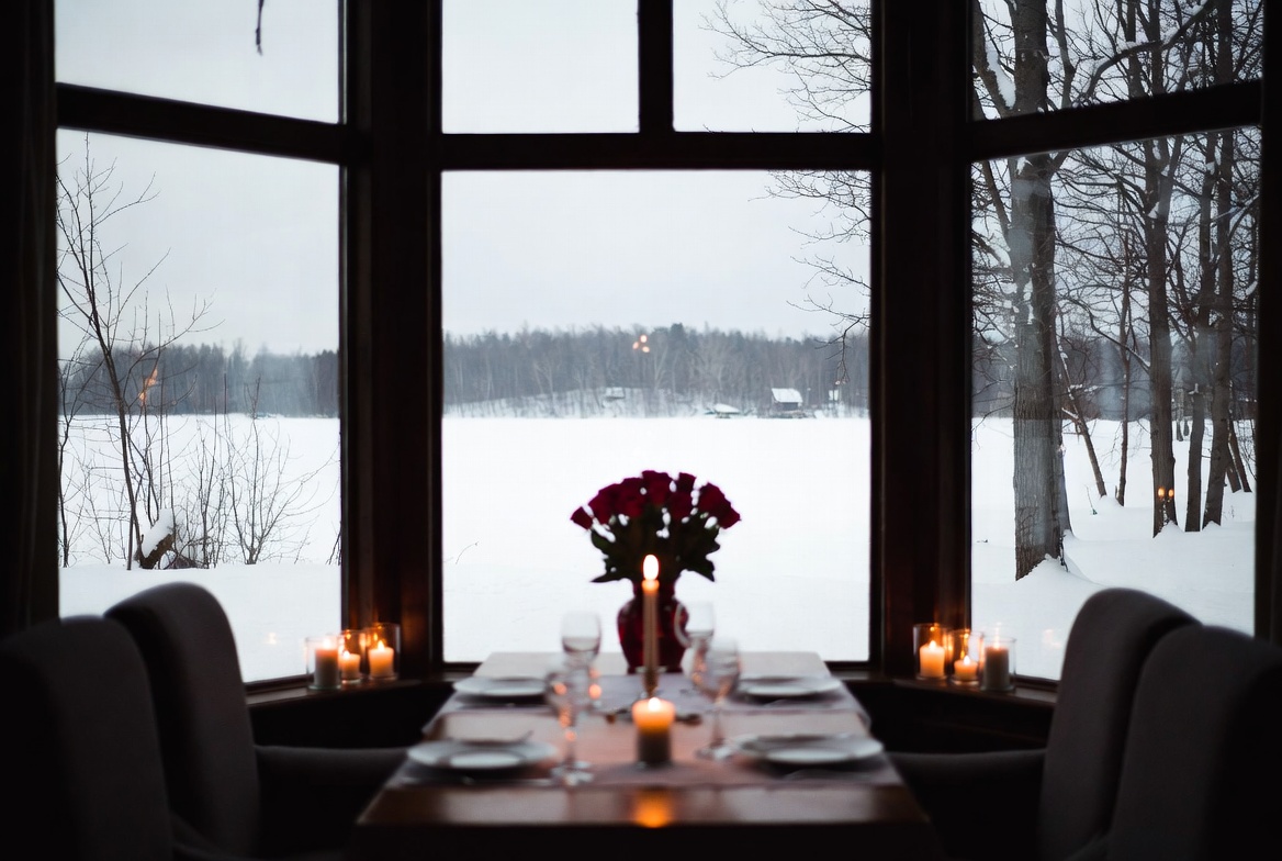 A warm dining setup featuring candles and flowers, with a snowy landscape visible through the large windows. Perfect for a winter gathering.