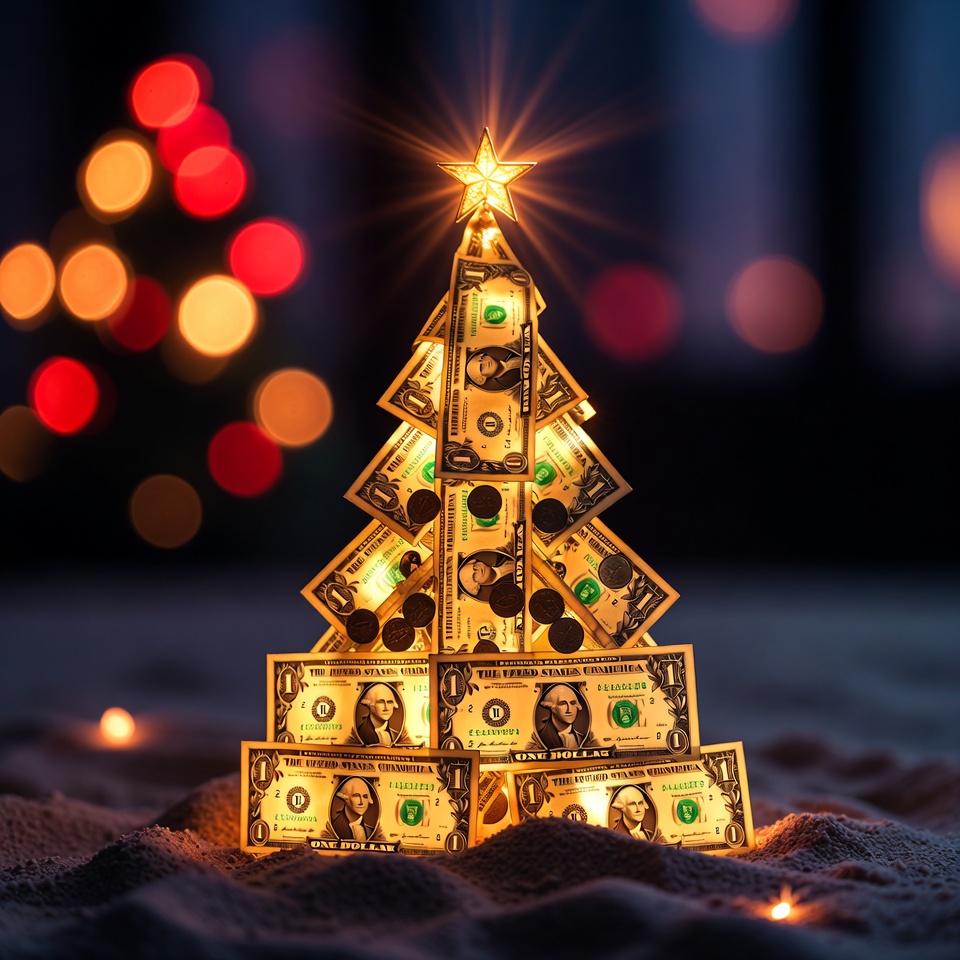 A unique Christmas tree made of cash, illuminated with a star on top. The background features decorative lights, adding a festive glow.