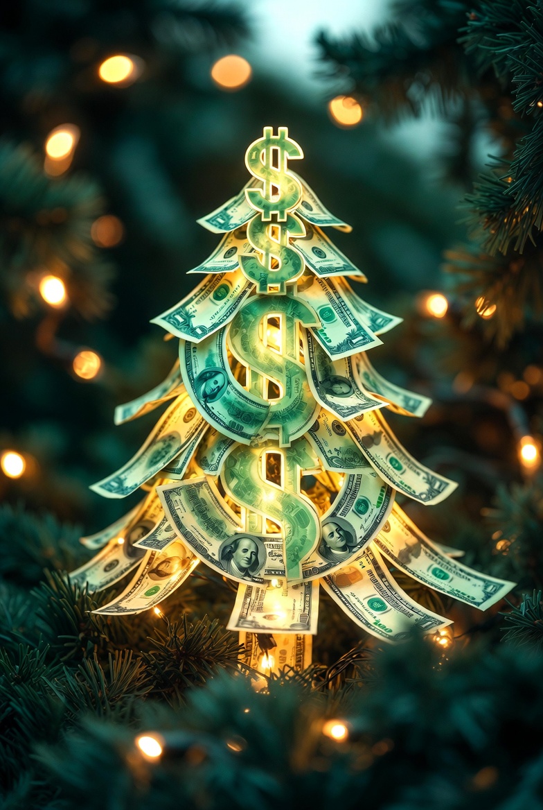 A decorative tree featuring dollar bills and glowing lights stands amidst green pine branches, symbolizing wealth during the holiday season.