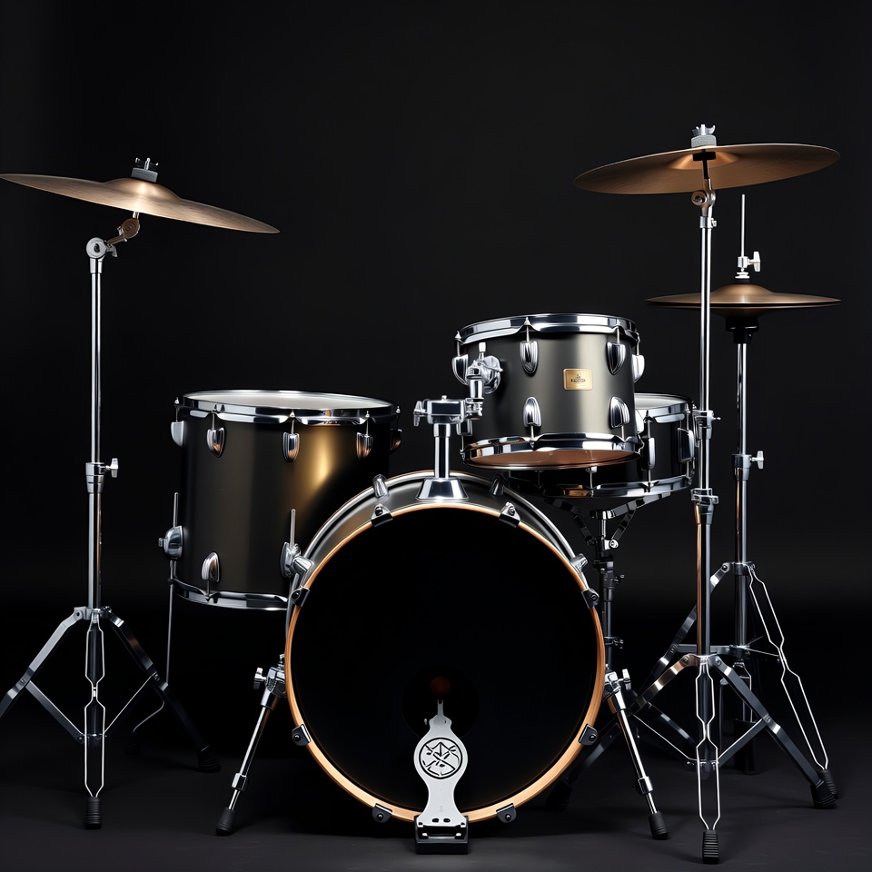 A shiny, professional drum set is set up on a dark stage, ready for a performance. The scene highlights the drums and cymbals in detail.