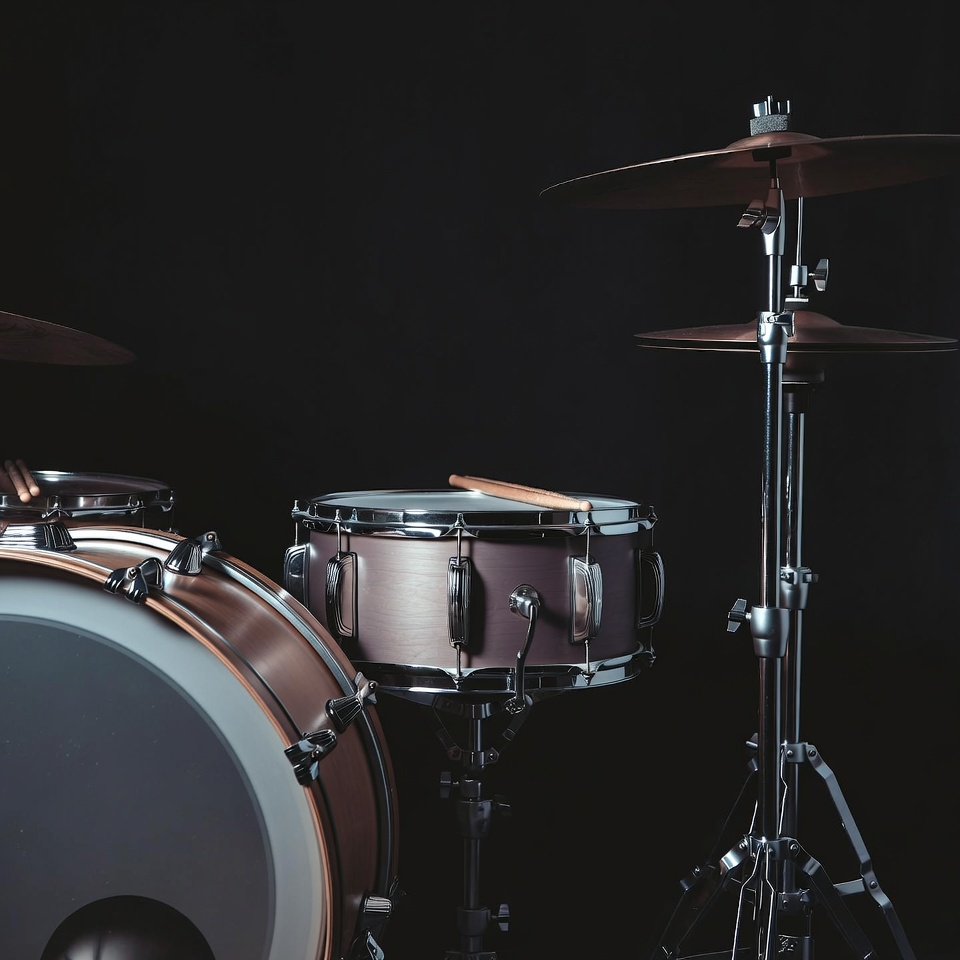 audio equipment, bass drum, beat, creativity, cymbals, dark background, drum kit, genre, instruments, music industry, music setup, musician, percussion, performance, recording, rehearsal, rhythm, snare drum, sound, studio