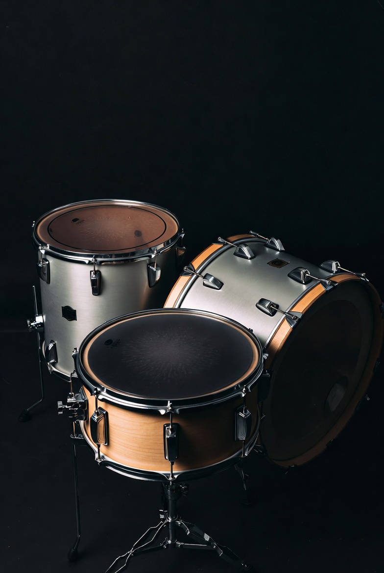 A silver and wooden drum set stands against a dark backdrop, showcasing its sleek design and ready for performance or practice.
