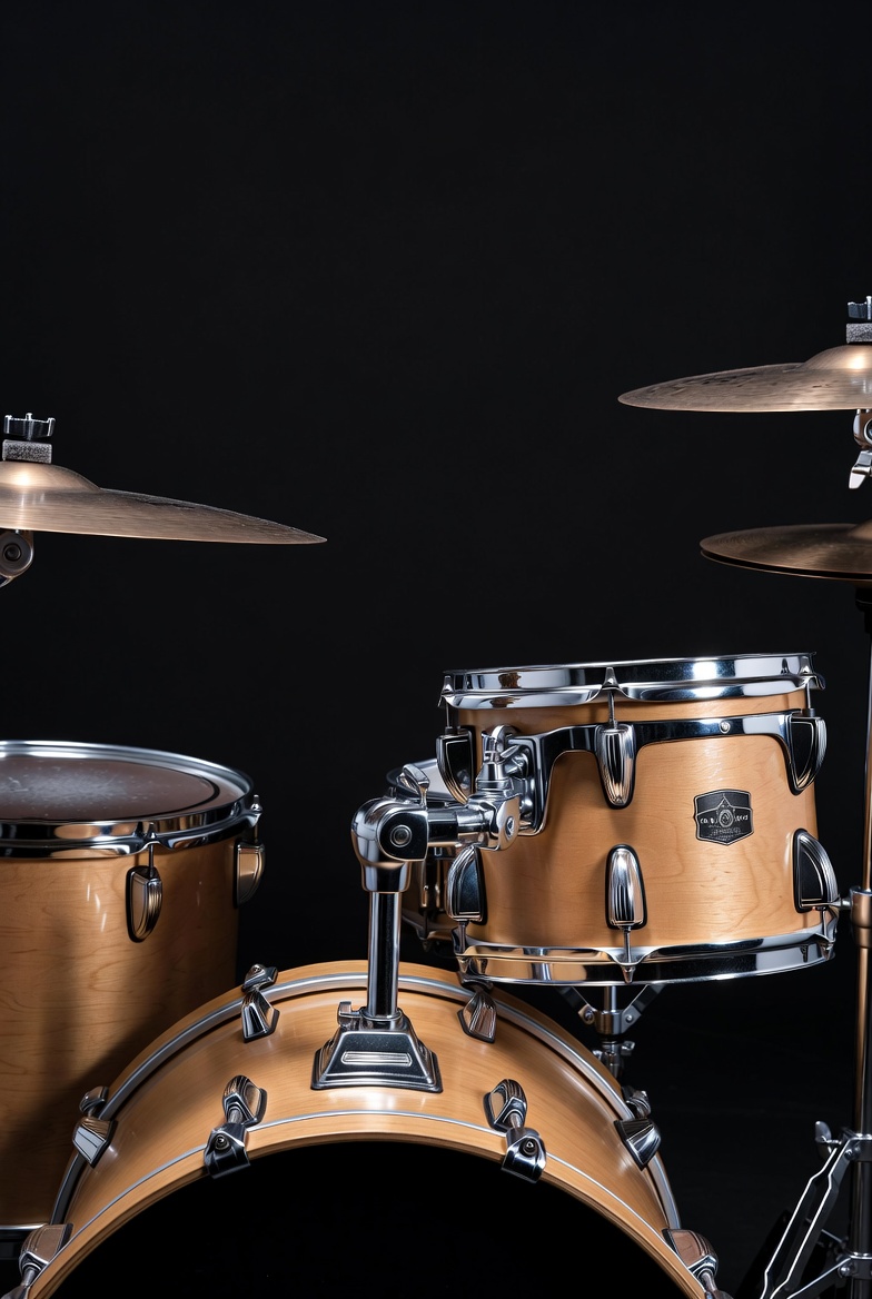 A shiny wooden drum set stands against a black backdrop, showcasing its classic design and polished cymbals. Perfect for a music performance.
