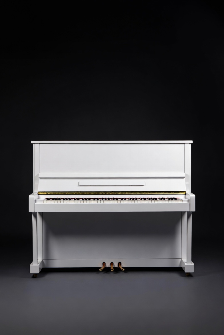 A sleek, modern white piano stands prominently against a dark backdrop, showcasing its smooth design and elegant keys for music lovers.