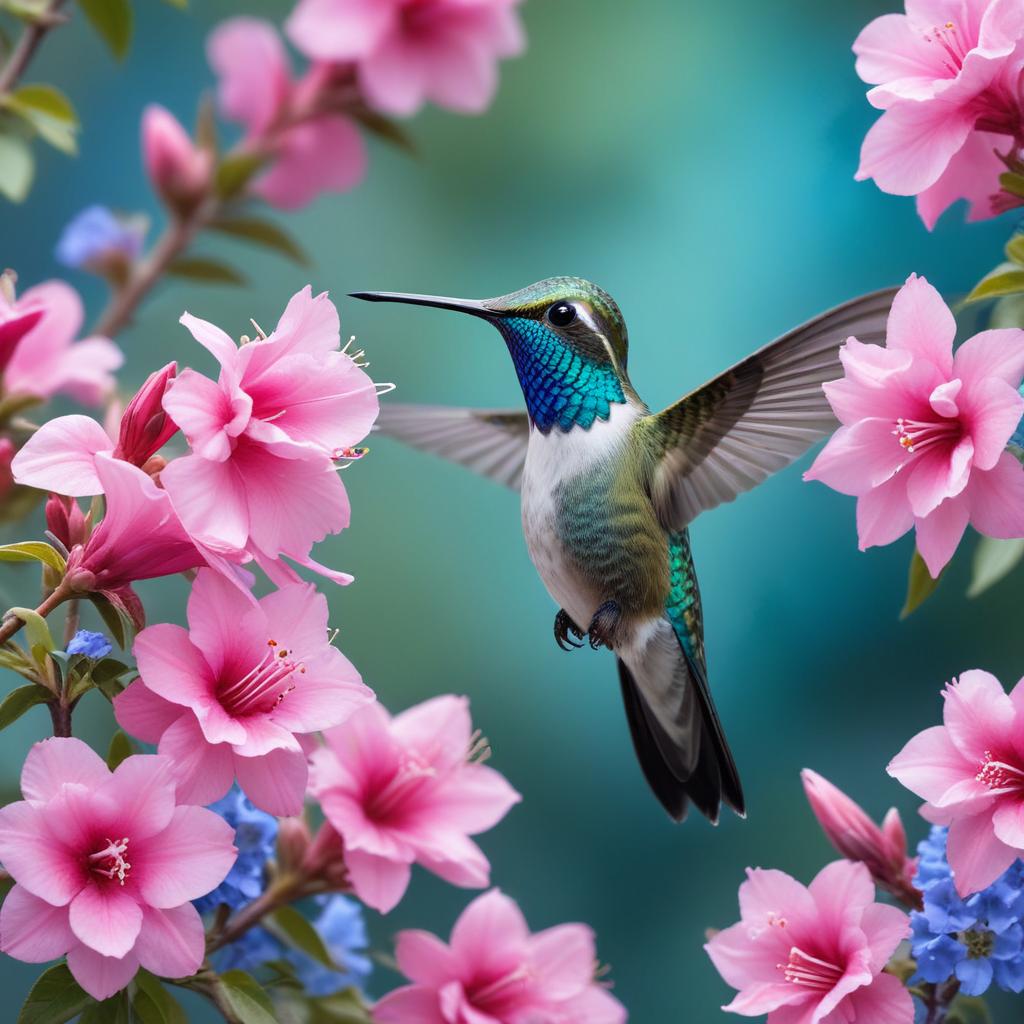 A vibrant hummingbird flits around pink blossoms, showcasing its iridescent feathers in a colorful scene filled with nature's beauty.