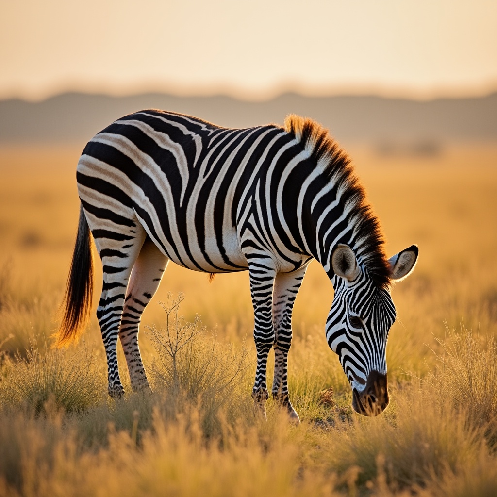 Africa, animal, environment, evening, golden grass, grazing, habitat, herbivore, landscape, nature, outdoor, savannah, serene, stripes, sunlight, sunset, tall grass, warm light, wildlife, zebra