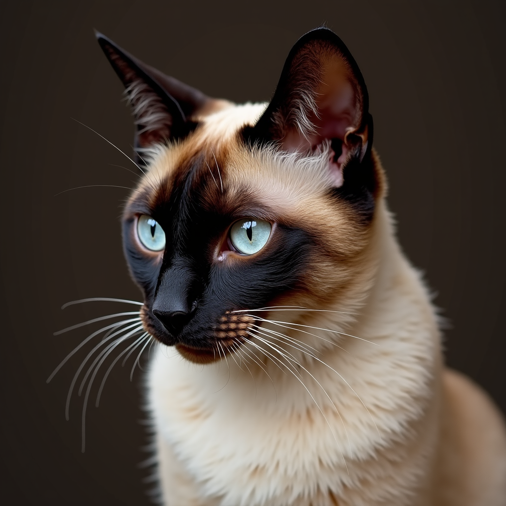 A Siamese cat poses proudly, showcasing its striking blue eyes against a dark background. The cat sits calmly, highlighting its unique fur pattern.