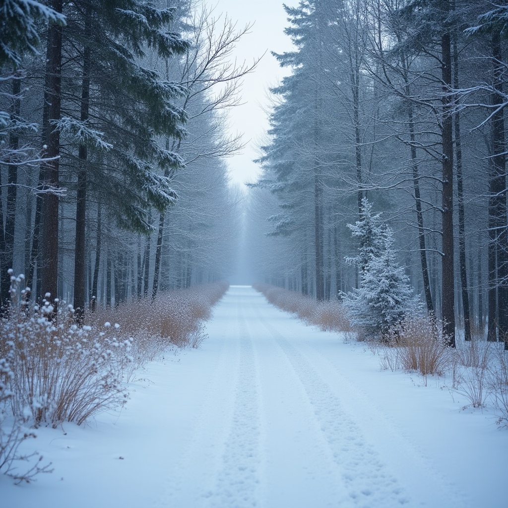 A peaceful scene shows a snow-covered path winding through tall trees, creating a serene atmosphere in a quiet winter forest.