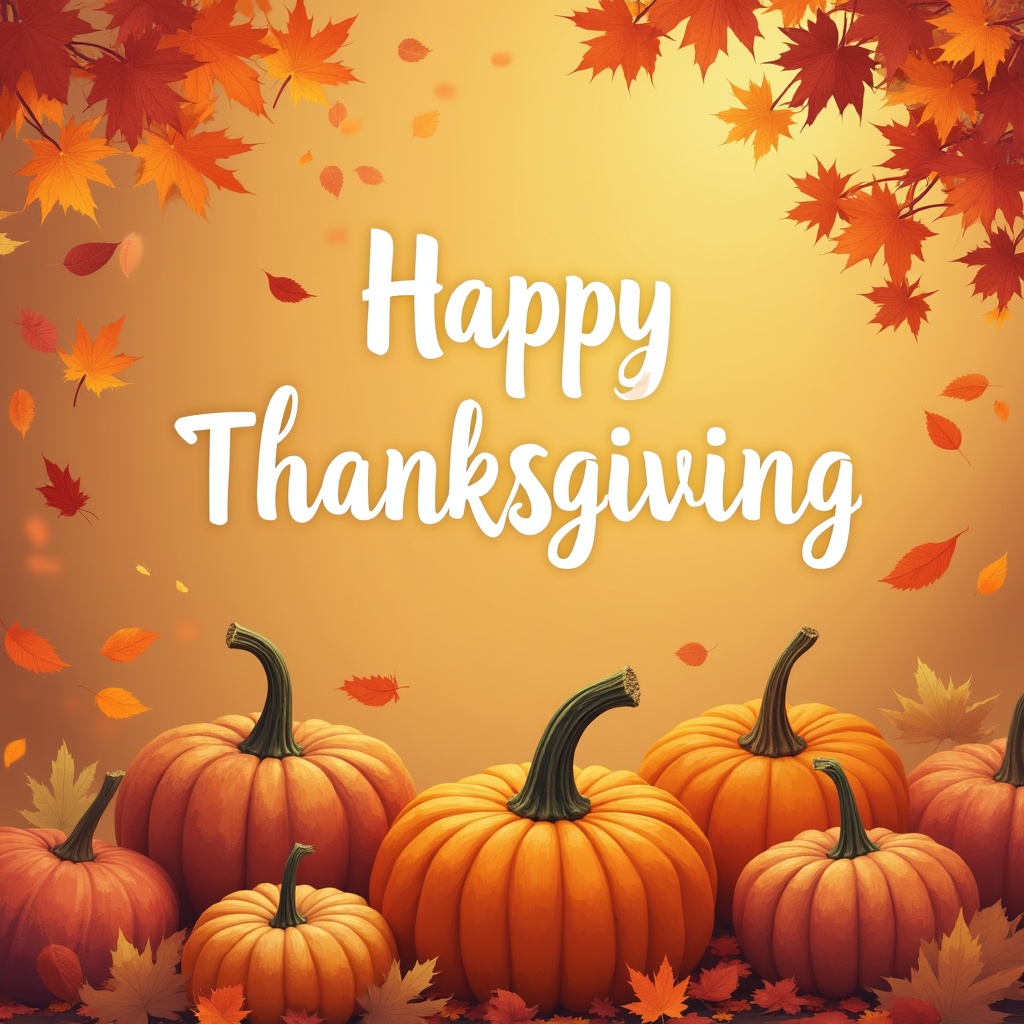 Vibrant pumpkins are surrounded by colorful autumn leaves. A warm greeting for Thanksgiving is displayed in an inviting design.