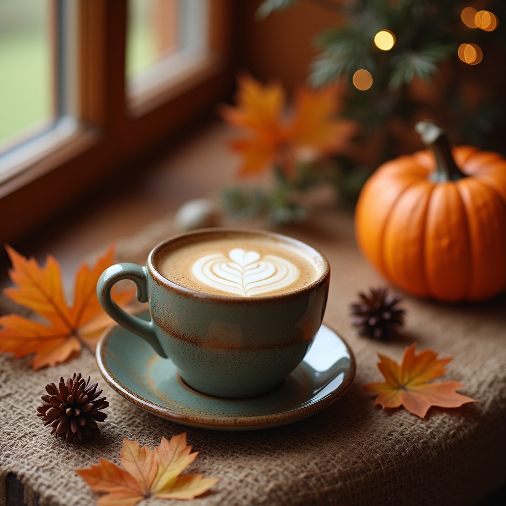 A cozy cup of coffee sits on a table by a window, surrounded by autumn leaves, a small pumpkin, and pine cones, creating a warm atmosphere.