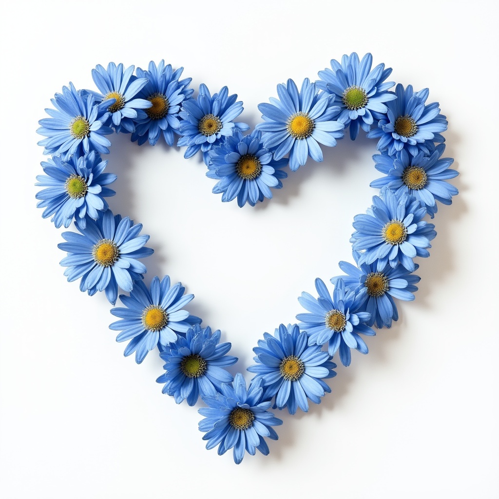 A heart shape made from beautiful blue flowers is displayed on a white background. The design adds a fresh and vibrant touch to any setting.