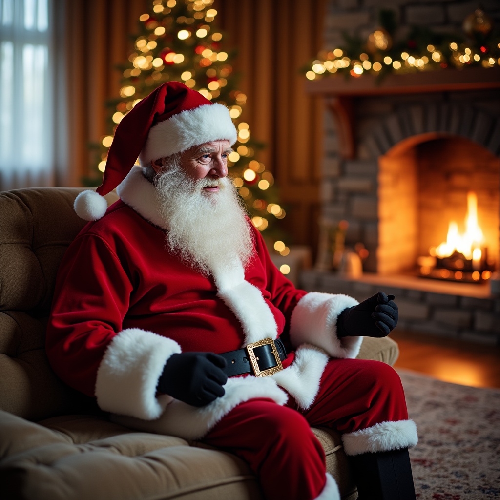 Santa Claus sits comfortably by the warm fireplace, surrounded by Christmas decorations. The festive tree glows softly in the background.