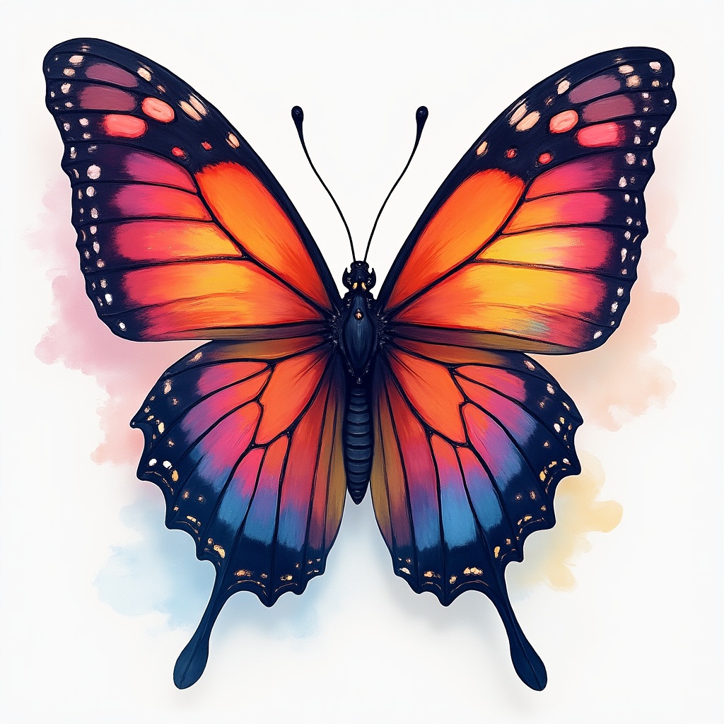 A colorful butterfly displays its striking wings in shades of orange, purple, and blue. The soft background enhances its beauty.