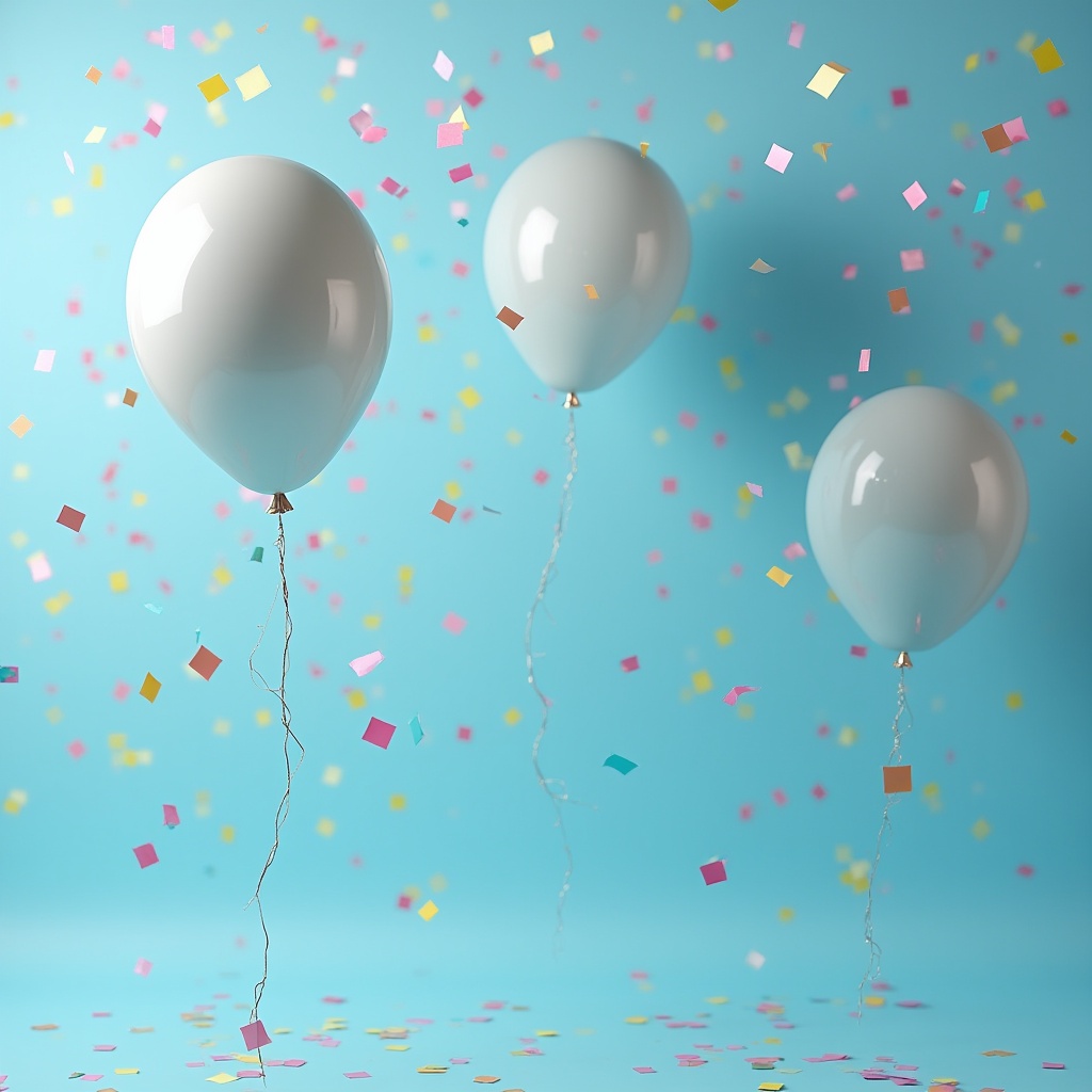 White balloons float against a blue background, surrounded by colorful confetti raining down, creating a festive atmosphere for a celebration.