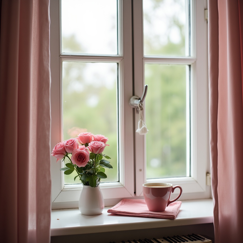 Fresh pink roses sit in a vase on a sunny windowsill beside a cup and a napkin, creating a warm and inviting atmosphere.