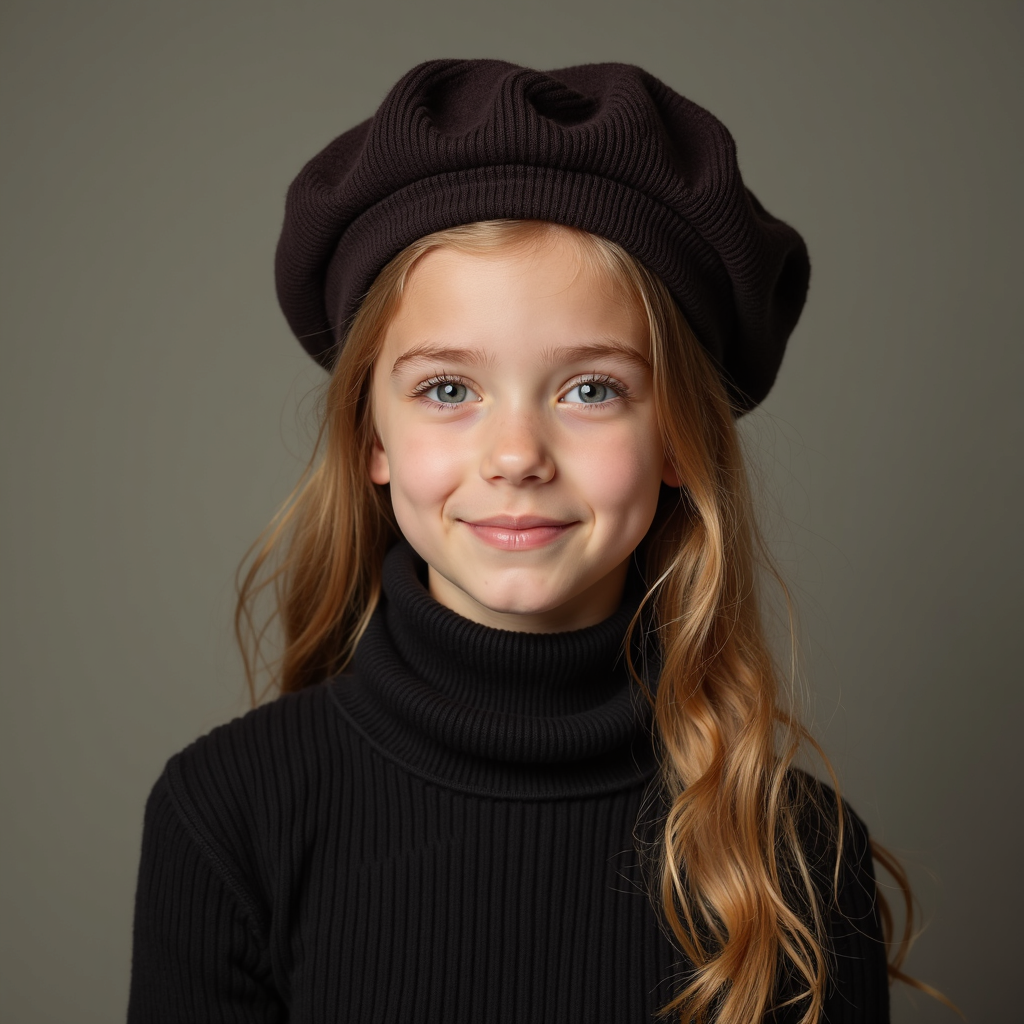 A young girl wears a black beret and turtleneck in a studio with a neutral background.