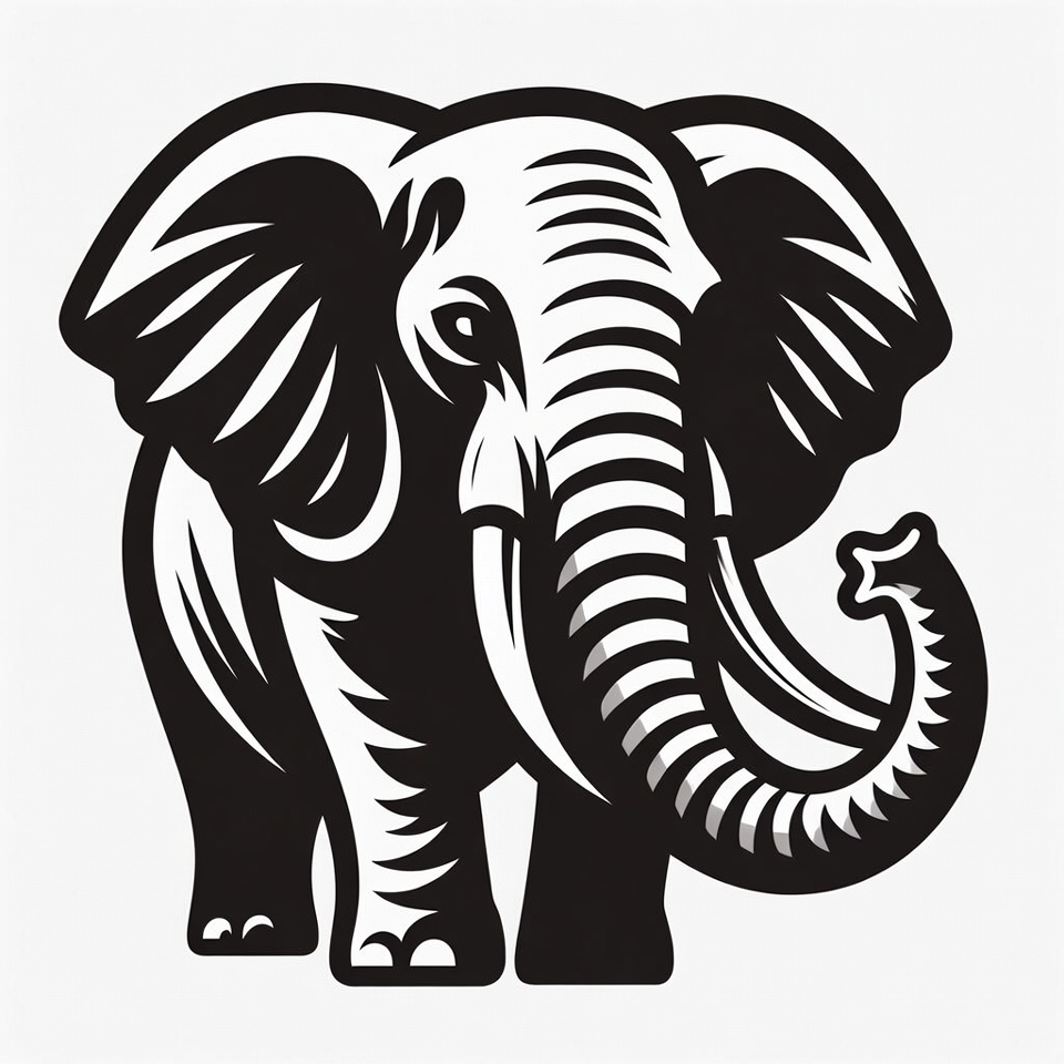 A strong, stylized illustration of an elephant stands prominently in black and white. The design highlights the elephant's size and grace.