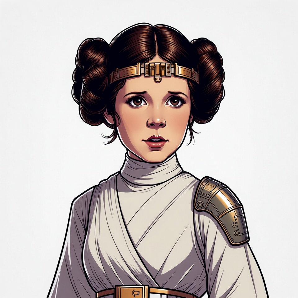A young girl dressed in a futuristic outfit with intricate details. She looks concerned, showcasing a unique hairstyle and bold accessories.