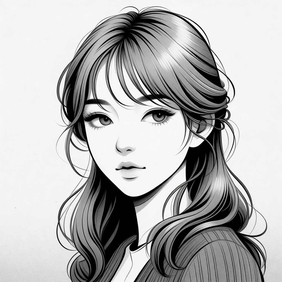 beauty, calm, character, design, detailed, elegance, expression, facial features, gaze, graphic, hairstyle, illustration, long hair, portrait, serene, simplicity, style, woman, young, youth