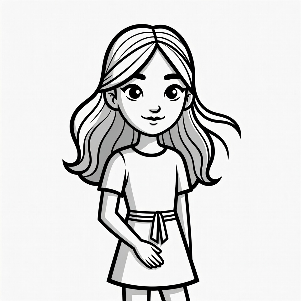 A young girl with long hair stands confidently wearing a simple dress. Her expression shows friendliness as she poses for an illustration.