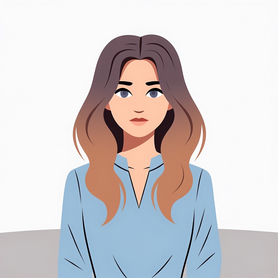 A young woman with long wavy hair is depicted, wearing a blue top, sitting against a simple background with a neutral tone.