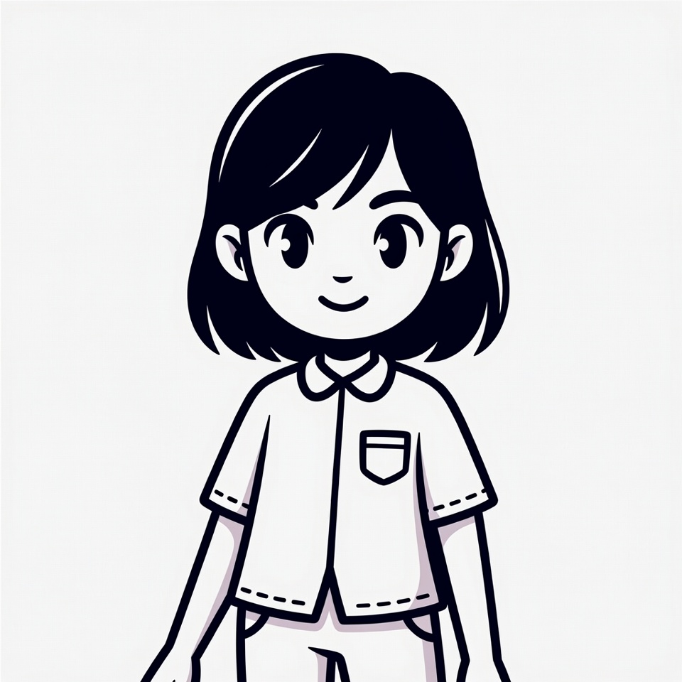 A friendly girl character stands smiling, wearing a simple outfit with a pocket. Her black hair frames her face, created in a cartoon style.