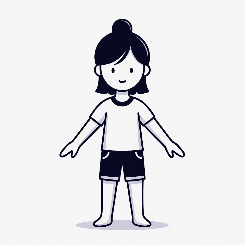 arms outstretched, boy, cartoon, casual, character, cheerful, child, design, footwear, girl, happy, illustration, kid, outfit, playful, shorts, simple, standing, t-shirt, young