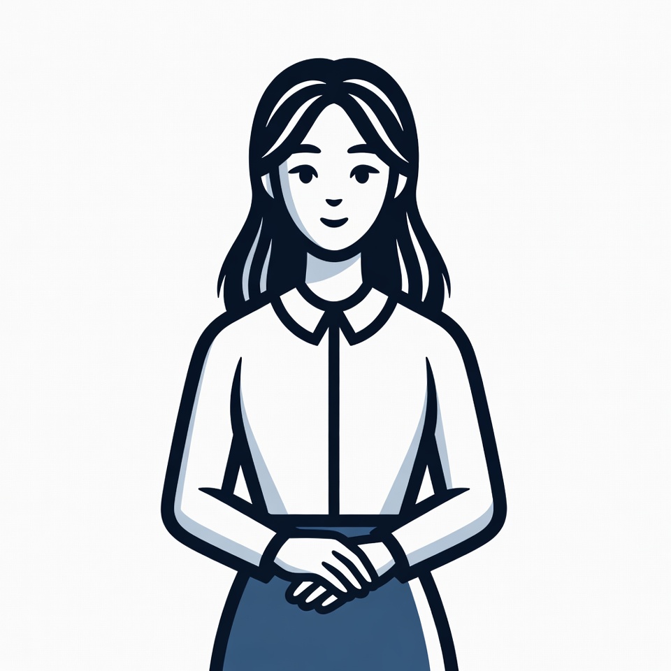 A woman with long hair stands confidently, smiling gently while wearing a buttoned shirt. She presents a friendly and approachable demeanor.