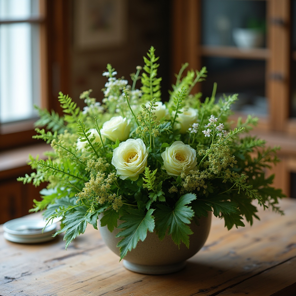 blooming petals, bouquet, centerpiece, floral arrangement, floral design, fresh flowers, greenery, home decor, indoor plants, kitchen decor, natural light, nature, organic materials, rustic style, simple elegance, soft colors, spring flowers, stylish arrangement, white roses, wooden table