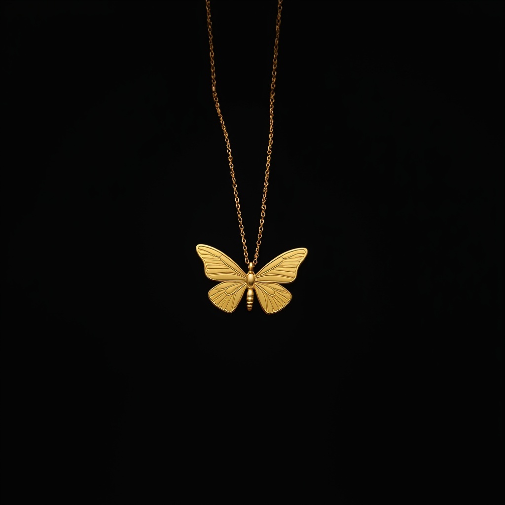 A gold butterfly necklace hangs gracefully against a black background, showcasing its intricate design and elegant shine.