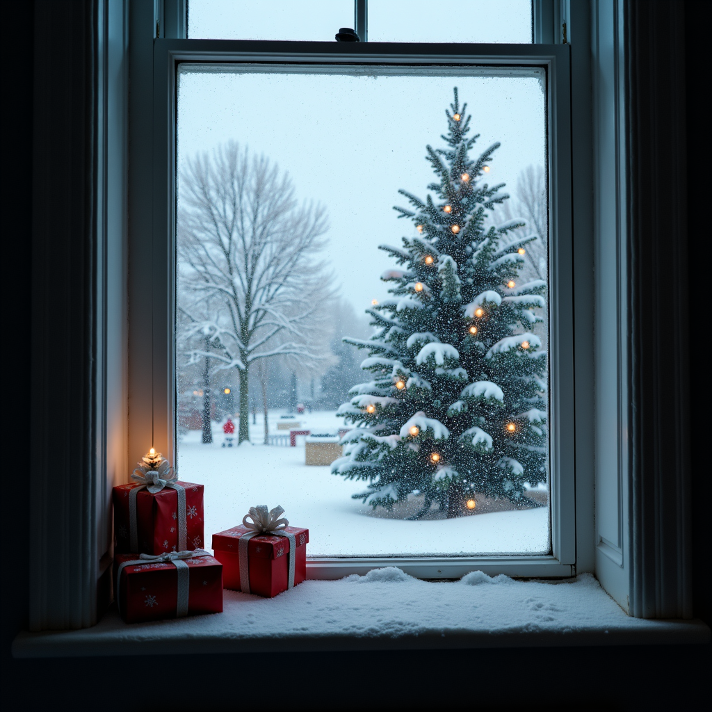 Snow falls outside a window, framing a decorated tree. Presents sit on the sill, adding to the cozy winter atmosphere.