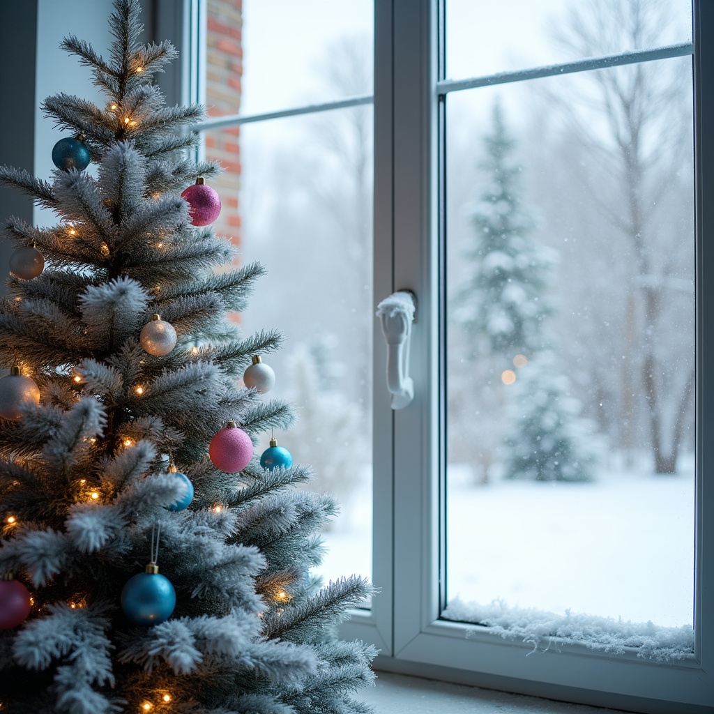 atmosphere, celebration, christmas, cold, cozy, decoration, festive, holiday, home, indoors, landscape, lights, ornaments, pine, season, snow, tree, view, window, winter