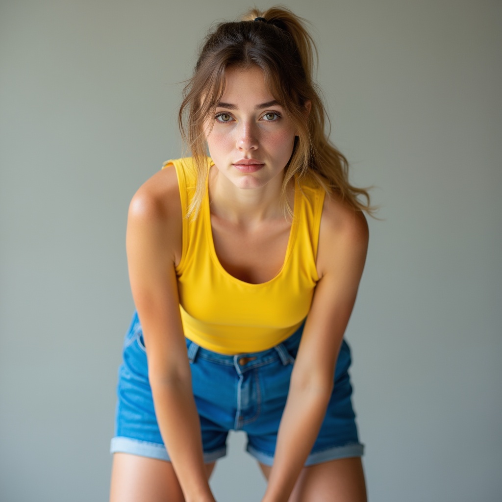 body language, bright top, casual fashion, comfortable clothing, creativity, denim shorts, direct gaze, fashion, indoor, lifestyle, portrait, pose, serious expression, simplicity, standing, studio, style, woman, young adult, youth